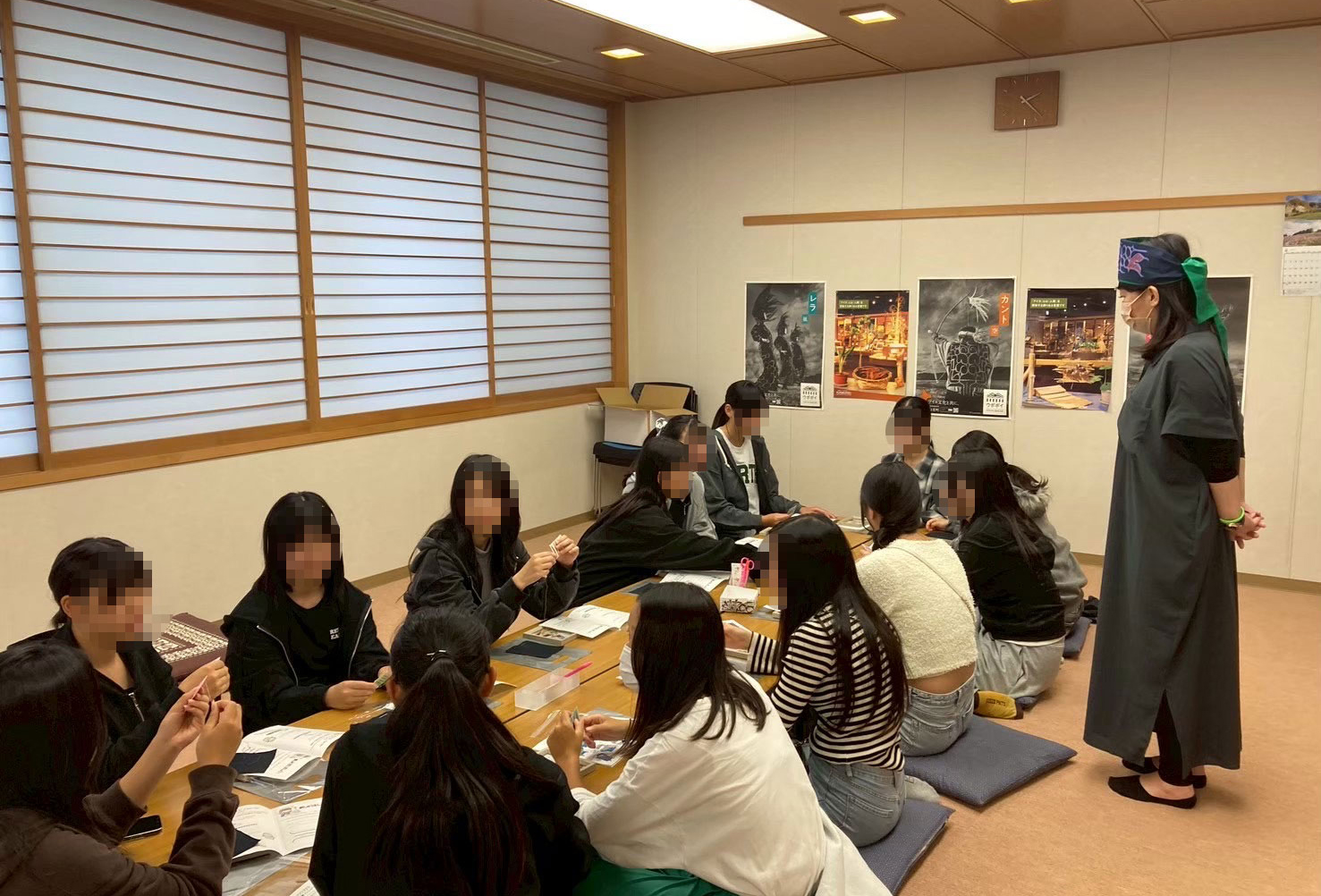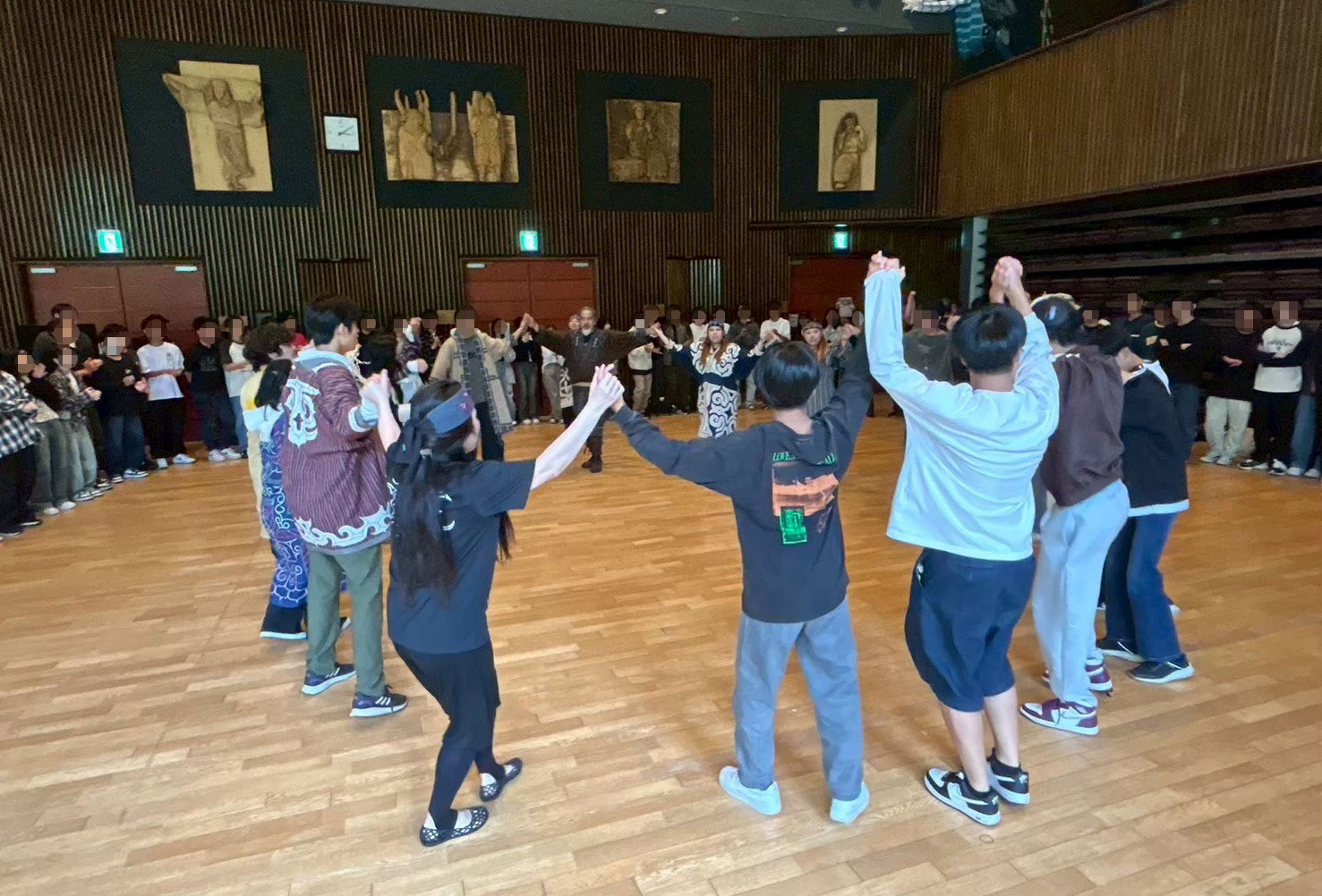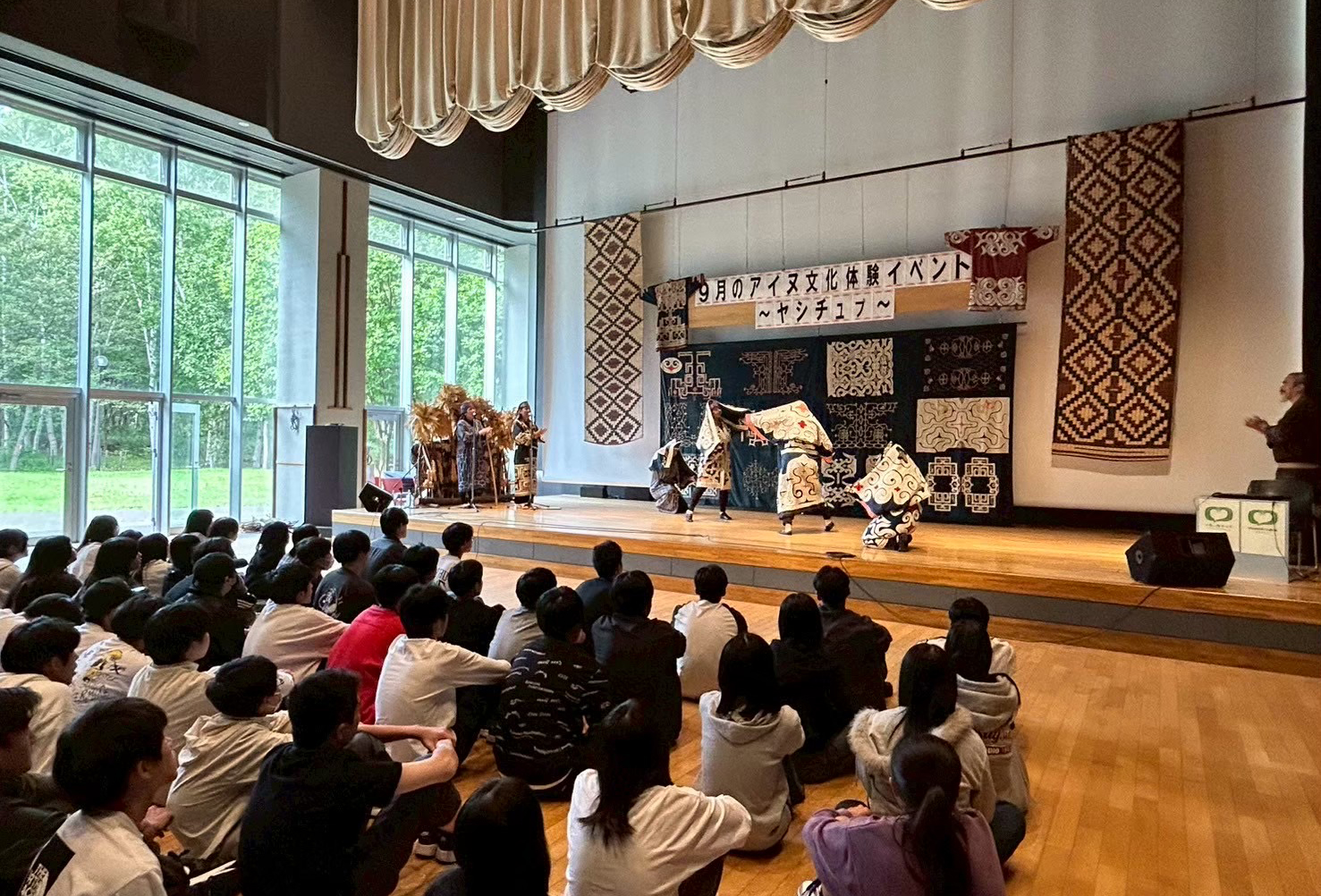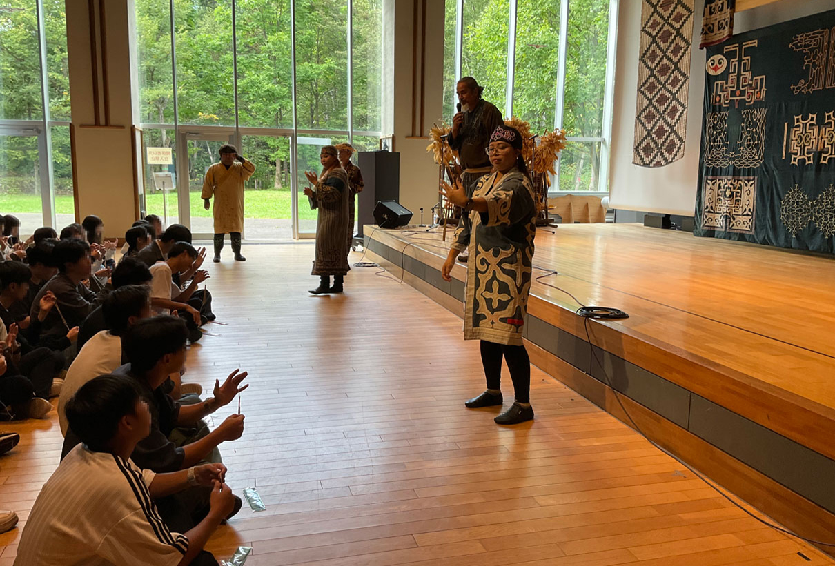 私はムックリと舞踊のプログラムに参加しました。ピリカコタンの文化施設に入った瞬間から、生徒たちは空間が醸し出す雰囲気と壁にかかる模様や衣装に興味を示して、写真を撮っていました。ムックリという楽器は初心者が上手に鳴らすのは難しいのですが、だからこそみんな本気で音を出そうと夢中で取り組む姿が印象的でした。舞踊では、生徒が前に出て踊らせてもらったり、衣装を着せてもらったりと、貴重な体験ができて本当に良かったと思います。